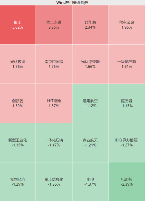 盘面上,稀土板块大爆发,大金融持续发力,有机硅、光伏、创新药等概念股走高;汽车、传媒、国防军工等板块走低。