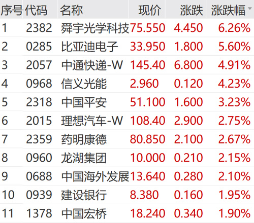 港股市场上午同步震荡,截至午间收盘,恒生指数涨0.09%,恒生国企指数涨0.3%,恒生科技指数跌0.44%。舜宇光学科技涨超6%,领涨恒指成份股。