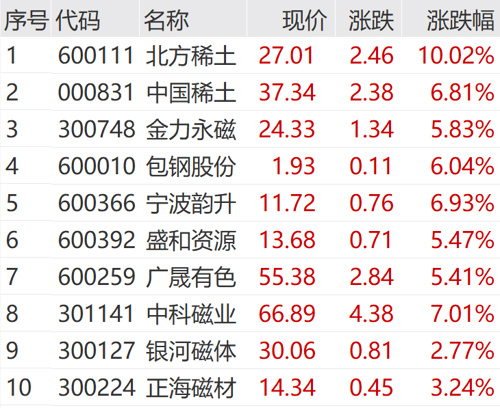 除北方稀土外,中国稀土、中科磁业、金力永磁、包钢股份、宁波韵升等稀土永磁概念股均有明显涨幅。
