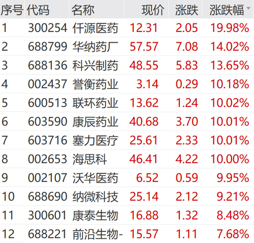 另外,上午医药股局部走高,创新药概念股继续火热。仟源医药20cm涨停,誉衡药业、联环药业、康辰药业、塞力医疗、海思科等多股集体涨停。
