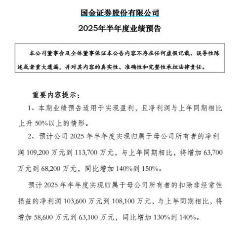 国金证券公告称,预计2025年上半年归属于母公司所有者的净利润为10.92亿~11.37亿元,同比增长140%~150%。扣非净利润为10.36亿~10.81亿元,同比增加130%~140%。