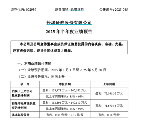 长城证券预告,2025年上半年归母净利润预计同比增长85%至95%,为13.35亿元至14.07亿元。在扣非净利润指标方面,预计上半年为13.29亿元至14.01亿元,同比增长85%至95%。上述财务数据未经会计师事务所预审计。