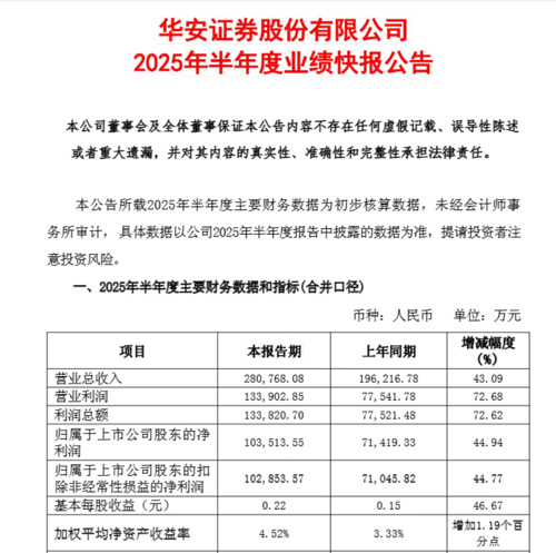 华安证券业绩快报显示,2025年上半年,公司实现营业收入28.08亿元,同比上涨43.09%,实现归属于上市公司股东的净利润10.35亿元,同比上涨44.94%。