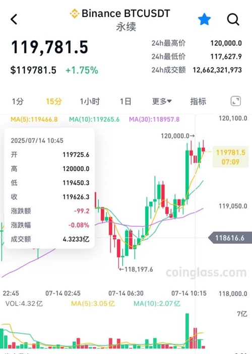 北京时间7月14日11点左右,比特币价格短时快速上涨,首次突破12万美元,再创历史新高。