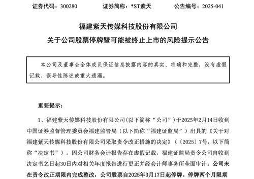 2月14日,*ST紫天收到中国证券监督管理委员会福建监管局(以下简称福建证监局)出具的《关于对福建紫天传媒科技股份有限公司采取责令改正措施的决定》(以下简称决定书)。