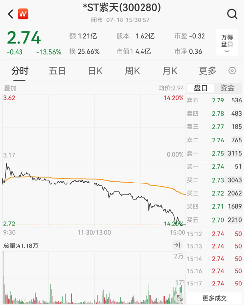 截至7月18日收盘,*ST紫天股价报2.74元/股,总市值为4.4亿元。