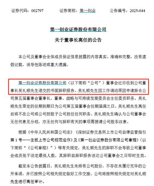 第一创业官宣董事长离任,“85后”副董事长代为履职