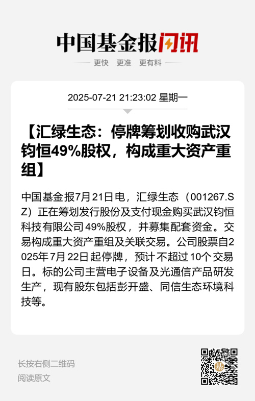 汇绿生态7月21日晚公告称,公司正在筹划发行股份及支付现金购买武汉钧恒49%股权并募集配套资金,交易构成重大资产重组及关联交易。公司股票自7月22日起停牌,预计不超过10个交易日。