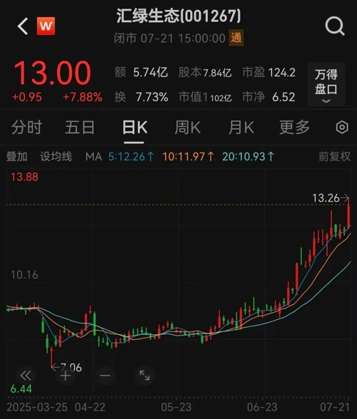 7月21日,汇绿生态股价一度触及涨停,最终以13元/股报收,涨7.88%,最新市值为102亿元。