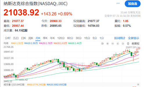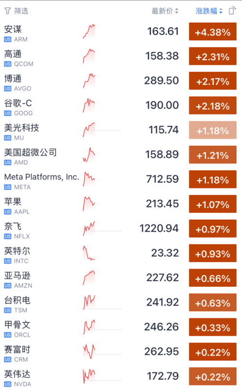 市场受到大型科技股上涨的提振。Alphabet(谷歌母公司)上涨约2%,Meta(原Facebook)和苹果股价也上涨逾1%。