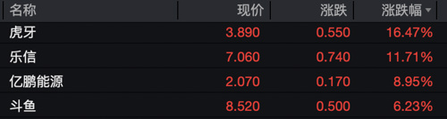 从市场表现来看,虎牙涨超16%,斗鱼上涨6.23%。