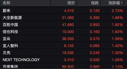 此外,蔚来上涨2.73%,百胜中国上涨1.82%,百度集团上涨1.13%。