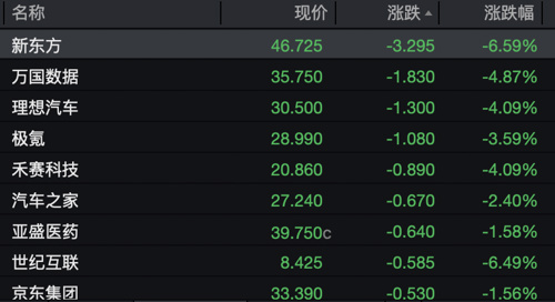 新东方下跌6.59%,理想汽车跌超4%,京东集团跌超1%。