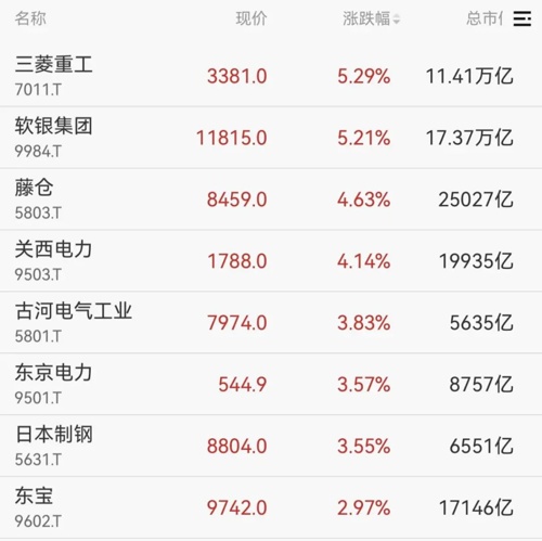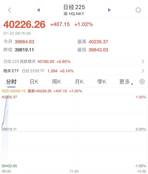 7月22日早间,日经225指数涨幅扩大至1%,三菱重工、软银集团均涨超5%。