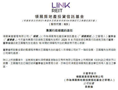 领展透露,董事会将展开全面的甄选程序,物色合适继任人,领导集团的下一阶段发展。王国龙将在过渡期间协助集团顺利交接。