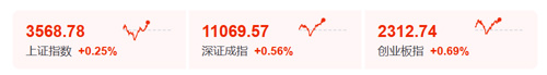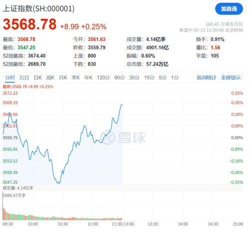 7月22日上午,A股三大股指小幅上涨。截至午间收盘,上证指数报3568.78点,涨0.25%;深证成指报11069.57点,涨0.56%;创业板指报2312.74点,涨0.69%。