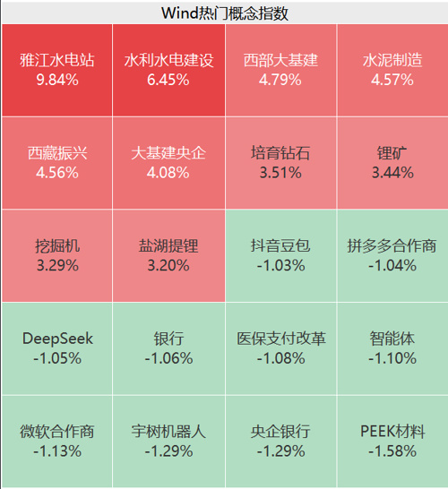 盘面上,上午大基建板块全面爆发,贵金属、建筑等板块领涨A股,雅江水电站、水利水电建设、西藏振兴、水泥制造等概念股持续火热;互联网、保险、银行板块整体走低,PEEK材料、宇树机器人、央企银行等概念股不振。