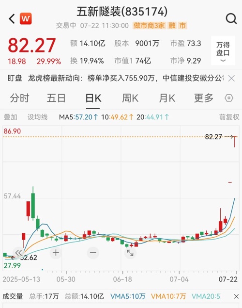 7月22日上午,雅江水电站概念股持续爆发。北交所五新隧装连续2个交易日30cm涨停,公司市值突破74亿元。