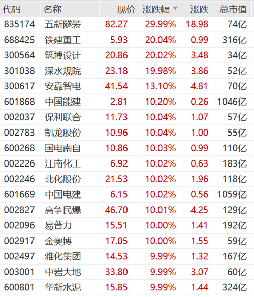 涨停潮再现。铁建重工、筑博设计、西宁特钢、保利联合、中国电建、高争民爆等20多只个股涨停;深水规院、中国能建、保利联合、中国电建、西藏天路、高争民爆等核心股连续多个交易日涨停。