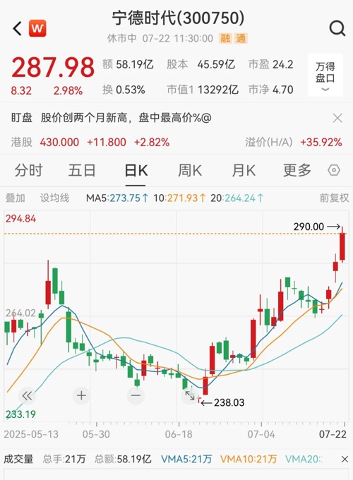 7月22日上午,宁德时代AH短线齐升,A股涨近3%,近3日累涨逾8%;H股涨近3%,近3日累涨超14%。