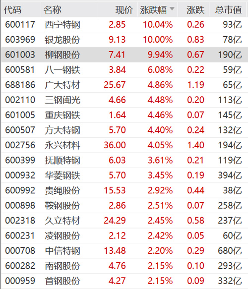 A股市场钢铁股普涨。其中,西宁特钢、银龙股份、柳钢股份涨停,八一钢铁、广大特材、三钢闽光、重庆钢铁、方大特钢、永兴材料等跟涨。