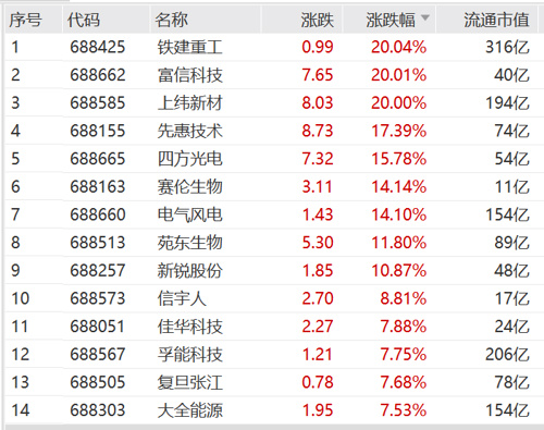 成份股方面,寒武纪涨超2%,中微公司涨2.72%,联影医疗涨逾2%,铁建重工、富信科技、上纬新材涨停,博瑞医药、晶科能源、盛美上海、拓荆科技等个股飘红。