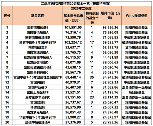 Wind数据显示,从季度增持市值数据来看,二季度被FOF增持最多的基金为博时信用优选E,该基金二季度被FOF增持9.36亿元,持有市值达10.16亿元。紧随其后的是博时安悦短债A、博时信用债纯债B,在二季度分别被FOF增持7.60亿元、7.11亿元,持有市值达7.63亿元、7.36亿元。此外,博时中债0-3年国开行ETF、南方收益宝B、博时富瑞纯债A、易方达安和中短债A在二季度也被FOF增持较多,增持市值均超4亿元。