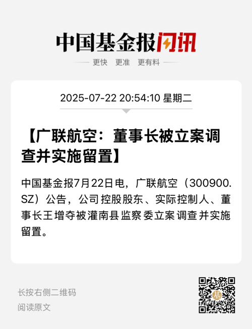 7月22日,广联航空公告称,近日收到灌南县监察委签发的关于公司控股股东、实际控制人、董事长王增夺的《留置通知书》和《立案通知书》,王增夺被立案调查并实施留置。