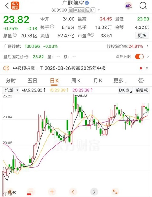截至7月22日收盘,广联航空报收于23.82元/股,最新市值为70.78亿元。