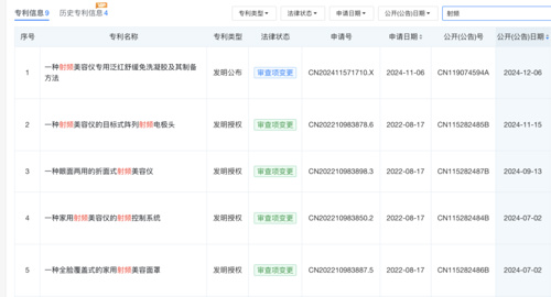 此外,贝泰妮也在加强美容仪的自主研发。天眼查显示,贝泰妮在2024年以来更新了多款与射频美容仪相关的专利内容,有的已经获得发明专利授权,有的则还在申请阶段。