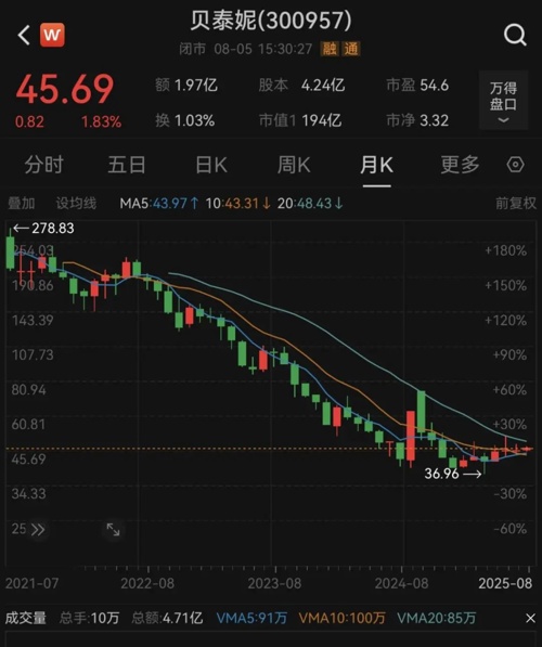 8月5日收盘,贝泰妮报45.69元/股,总市值为194亿元,距离巅峰时期已“蒸发”近千亿元,而贝泰妮当前股价也跌破当时47.33元的发行价,成为A股美妆板块首家破发企业。