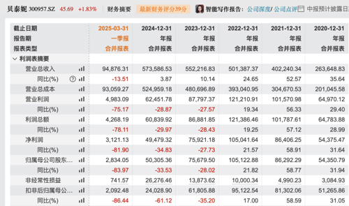 2025年第一季度,贝泰妮的表现再度恶化,营收同比降13.51%至9.49亿,净利润仅2834万,同比骤降83.97%。