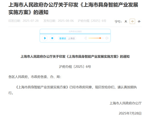 8月6日,上海市人民政府官网显示,上海市人民政府办公厅印发《上海市具身智能产业发展实施方案》(以下简称《实施方案》)。该文件自2025年7月28日起施行,有效期至2028年7月27日。