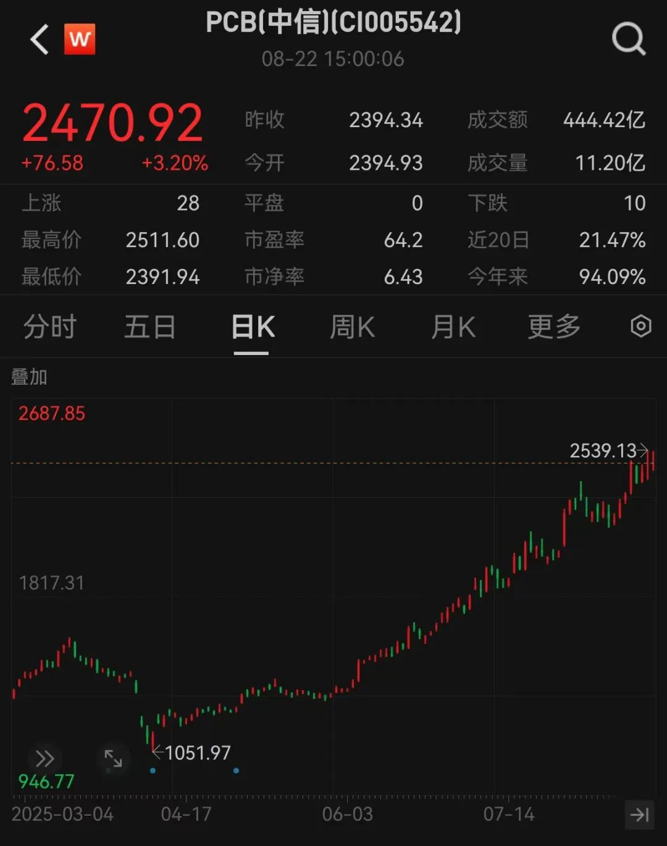 Wind统计显示,截至8月22日,中信PCB指数自4月低点以来最大涨幅超过140%。