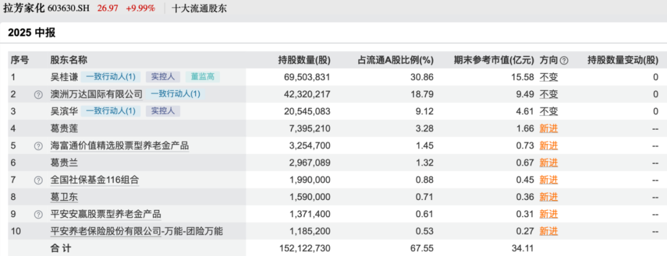 半年报显示,今年二季度末葛卫东以个人名义现身拉芳家化的流通股东名单,但仅买进了159万股,期末参考市值仅3600万元,为第八大流通股东;葛卫东家族的葛贵莲、葛贵兰同样现身该股股东榜,分别买进了739.52万股、296.71万股,期末参考市值分别为1.66亿元、6700万元。二季度末,葛卫东家族三个人合计持有拉芳家化的市值为2.69亿元。