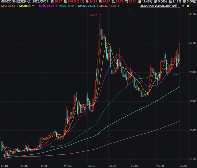 值得一提的是,9月1日早间拉芳家化开盘股价直线拉涨,很快封住了涨停板。该股今年以来走势强劲,5月下旬一度涨至30.87元/股,但此后出现大幅调整,7月下旬该股重拾升势。截至9月1日,拉芳家化报收于26.97元/股,今年以来涨幅高达96.52%,最新总市值为61亿元。