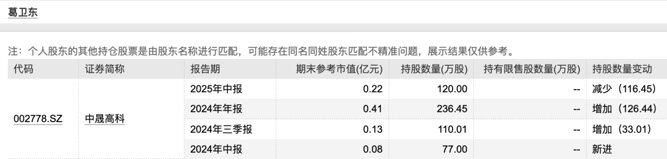 葛卫东今年二季度末再度现身中晟高科的前十大流通股东名单,持有120万股,期末参考市值仅为2200万元。事实上,葛卫东去年二季度末就买进了中晟高科,此后多个季度逐步加仓,但今年一季度末短暂退出了股东名单。