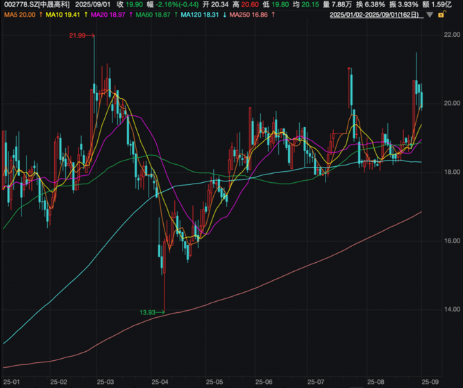 但中晟高科今年股价走势波折,4月一度跌至13.93元/股的位置,此后出现大幅反弹,截至9月1日,该股报收于19.90元/股,今年以来涨幅为13.97%,最新总市值仅25亿元。
