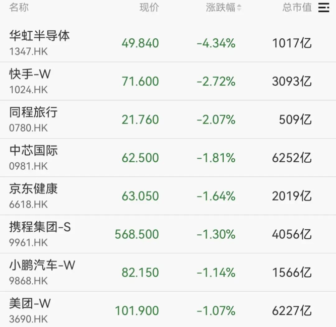 港股方面,三大指数悉数调整,华虹半导体、快手、同程旅行跌幅居前。
