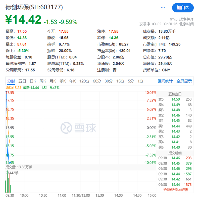 德创环保开盘涨停,随后股价跳水触及跌停,盘中上演“天地板”。