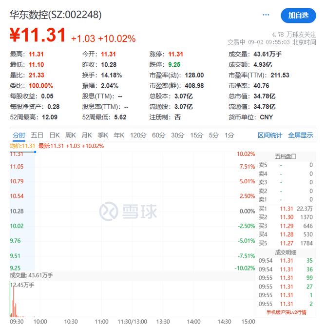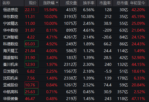 工业母机概念股开盘大涨,华东数控、宁波精达率先涨停,恒进感应涨超15%,华中数控、汇洲智能、科德数控等涨幅居前。