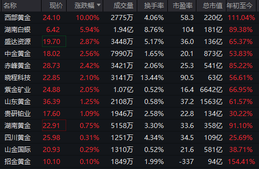 贵金属概念股震荡走高,西部黄金涨停,湖南白银、盛达资源、中金黄金等跟涨。