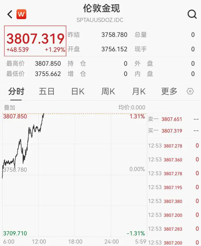 截至记者发稿,现货黄金报3807.319美元/盎司,日内涨1.29%。