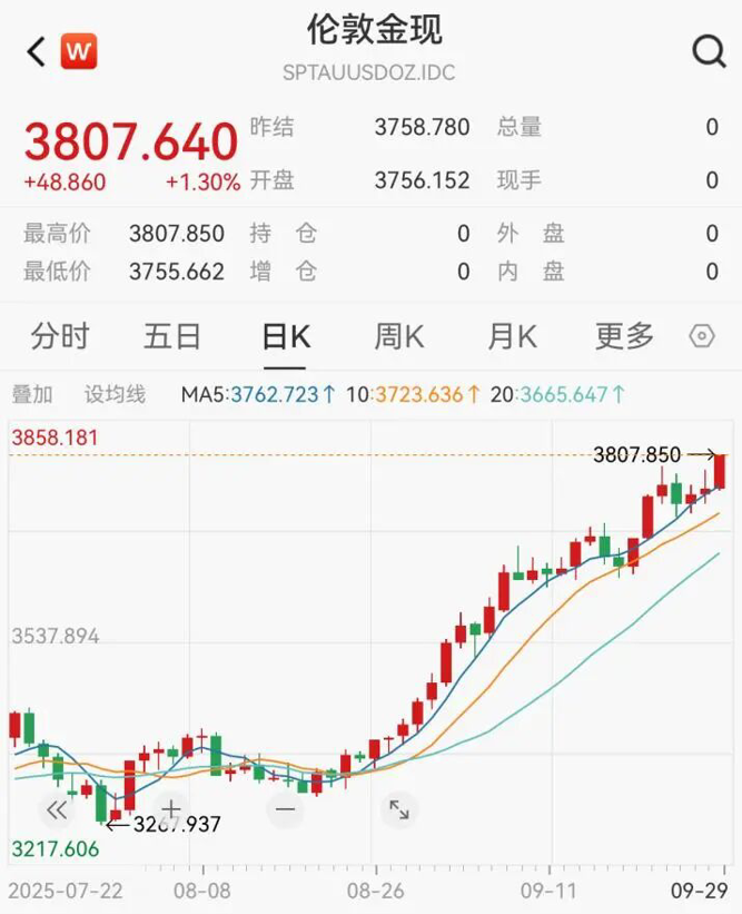 9月29日,现货黄金首次升穿3800美元/盎司,再创历史纪录。