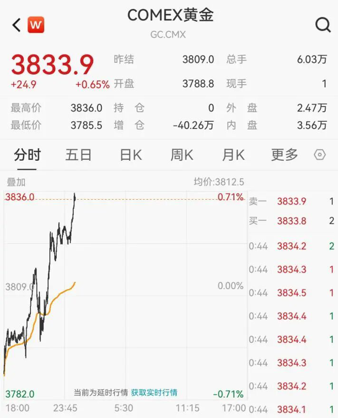 纽约期金站上3830美元/盎司,亦续刷历史新高。截至发稿报3833.9美元/盎司,日内涨0.65%。