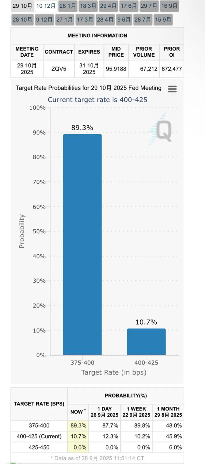 根据CME美联储观察的数据,交易员目前预计美联储10月份降息的可能性为89.3%,12月份降息的可能性约为66.6%。