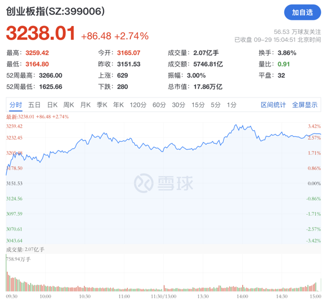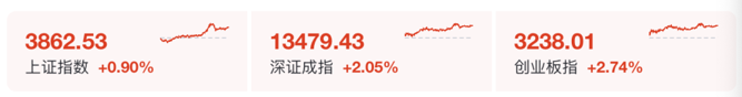 9月29日,A股三大股指全线飘红,创业板指和深证成指均涨超2%。截至收盘,沪指报3862.53点,涨0.90%,深证成指涨2.05%,创业板指涨2.74%。