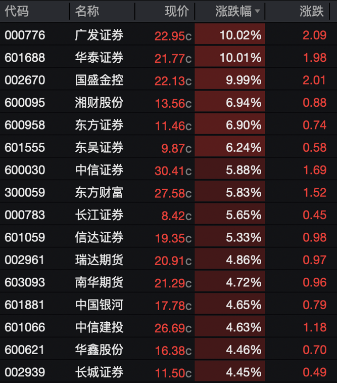 相关个股全线飘红。华泰证券、广发证券、国盛金控10cm涨停。湘财股份、东方证券、东吴证券涨超6%。