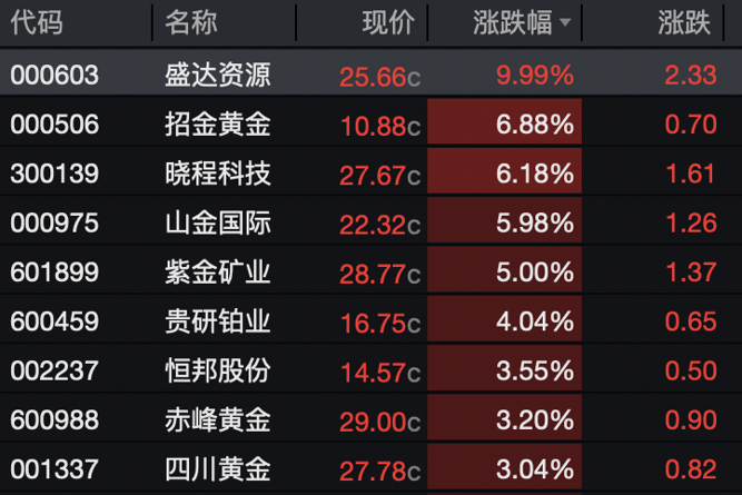 盛达资源录得10cm涨停,招金黄金,晓程科技涨超6%,山金国际、紫金矿业涨超5%,贵研铂业、恒邦股份、赤峰黄金、四川黄金等个股纷纷上涨。