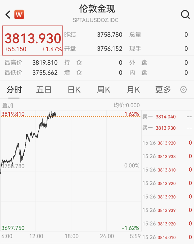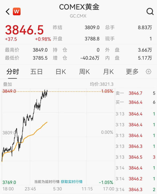 现货黄金冲破3810美元续创新高